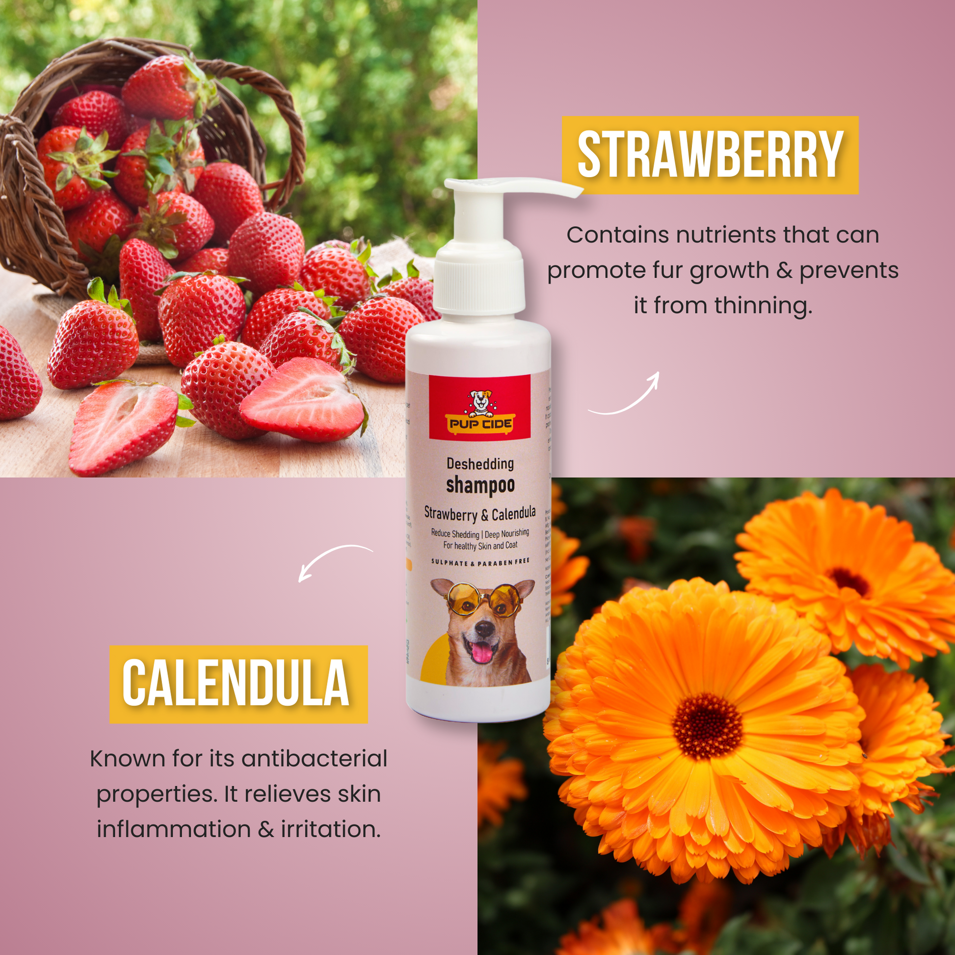 Introducing PUPCIDE Deshedding Shampoo, a revolutionary grooming solution for dogs of all breeds. Say goodbye to excessive shedding and hello to a luscious, healthy coat with our nutrient-rich formula infused with the goodness of strawberries and calendula.
